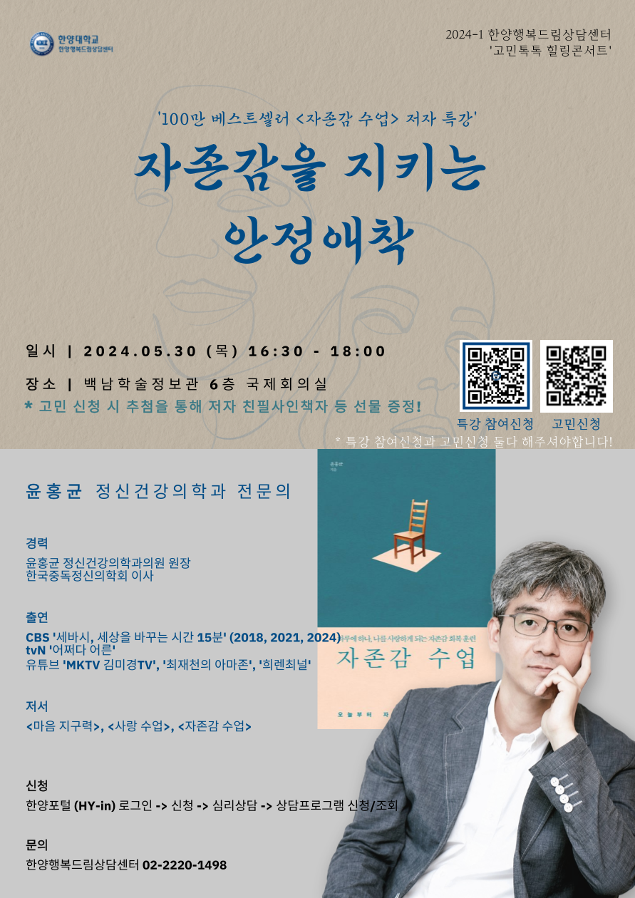 안녕하세요! 한양행복드림상담센터 '고민톡톡 힐링콘서트' 담당자입니다. 2024학년도 1학기 고민톡톡 힐링콘서트는 자존감 수업의 저자 윤홍균 선생님을 모시고 진행합니다. 자존감을 지키고 유지하는 것이 중요하다는 것은 이제 상식이 되었지만 실제 어떻게 해야하는지 난감한 경우가 많습니다. 이번 '고민톡톡 힐링콘서트'에서 어떻게 해야 건강한 정신건강을 유지하고 사회생활을 통한 성장을 이룰 수 있을지 윤홍균 선생님과 함께 알아가보겠습니다. 감사합니다. *특히 고민신청을 해주신 분들은 추첨을 통해 강연시간에 직접 답변을 해드리는 시간도 가질 예정입니다.